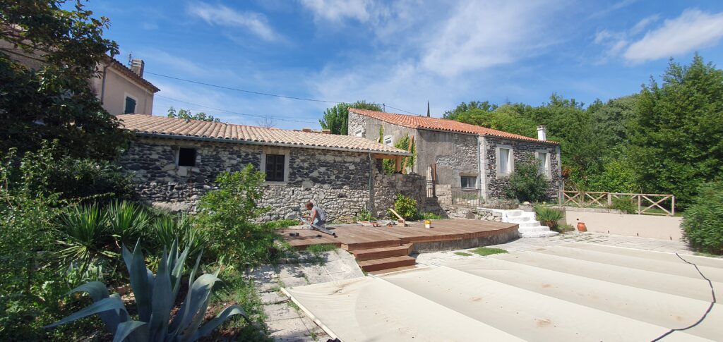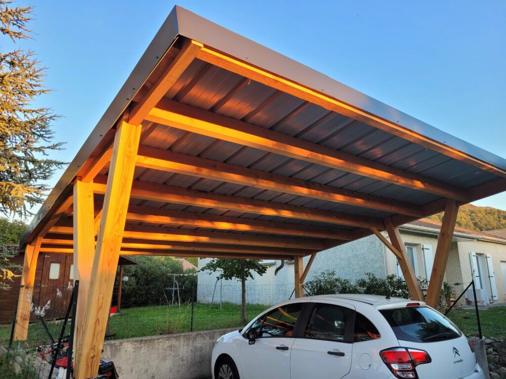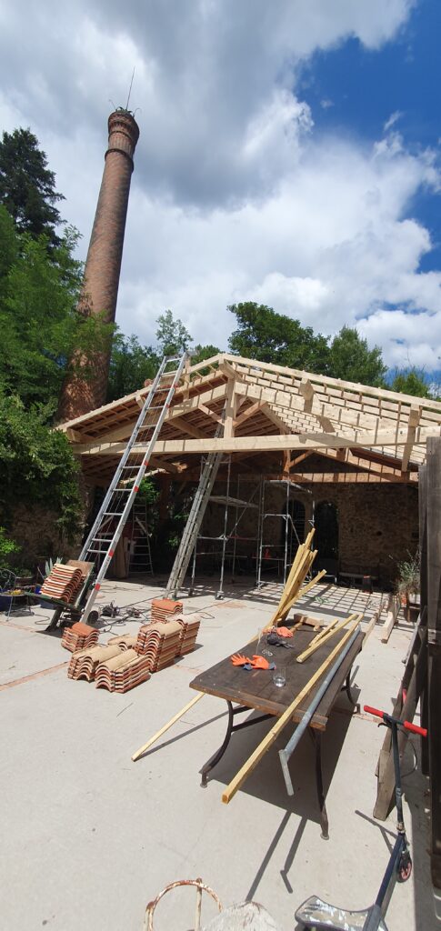 Charpente douglas chevillée à la tire. Assemblage des solives par queue d’aronde.